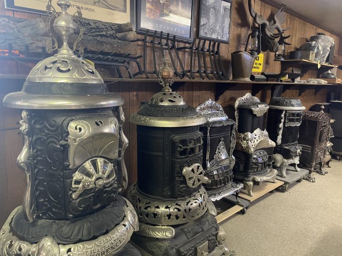 The jewel of Russell’s Smith’s antique coal and gas stove collection is an 1887 Germer coal stove, made in Erie and considered the “Cadillac” of stoves back in the day, with decorative medallions of the manufacturer's three daughters across the front.