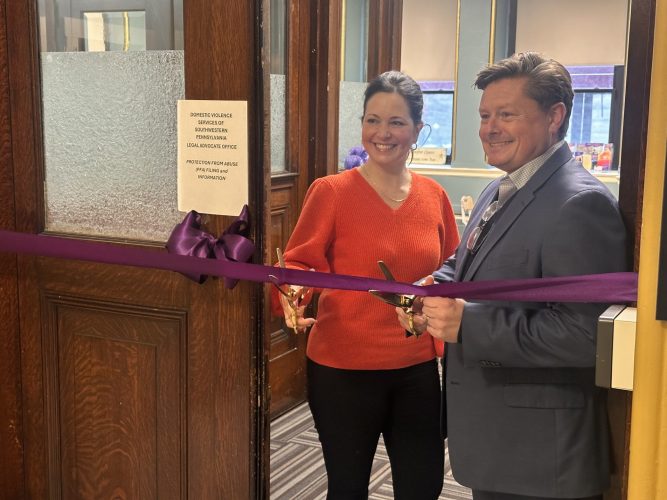 Washington County Commission Chairman Nick Sherman and Domestic Violence Services of Southwestern Pennsylvania CEO Megan Hegedus cut a ribbon Tuesday to officially open the new room inside the county courthouse to offer victims of domestic violence a safe space to meet with DVSSP staff or to ...