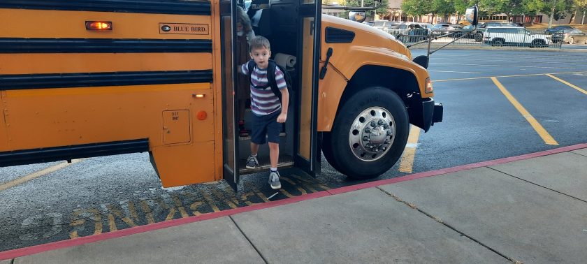 A.J. Kennedy, a first-grader at Waynesburg Central Elementary School, steps off the bus as he arrives for the first day of classes Tuesday.