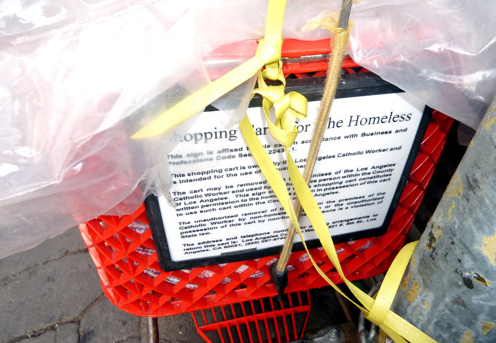 Los Angeles Catholic Worker even provides shopping carts for the homeless. The carts are designated by signs attached to each that read, in part, “This sign … constitutes written permission to the homeless person in possession of this cart to use such cart within the County of Los Angeles. … The unauthorized possession of this cart by non-homeless persons is a violation of the law.”