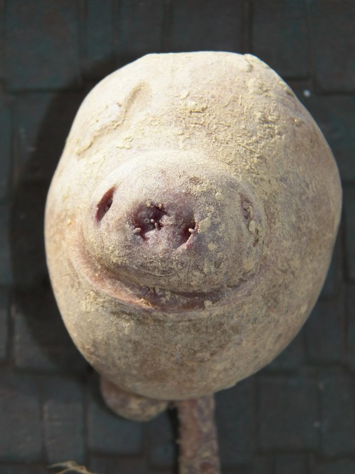 While digging our potatoes unusal shapes come out to greet us, this one in particuler reminded us of our pigs here at the farm. (Myrta Litman)