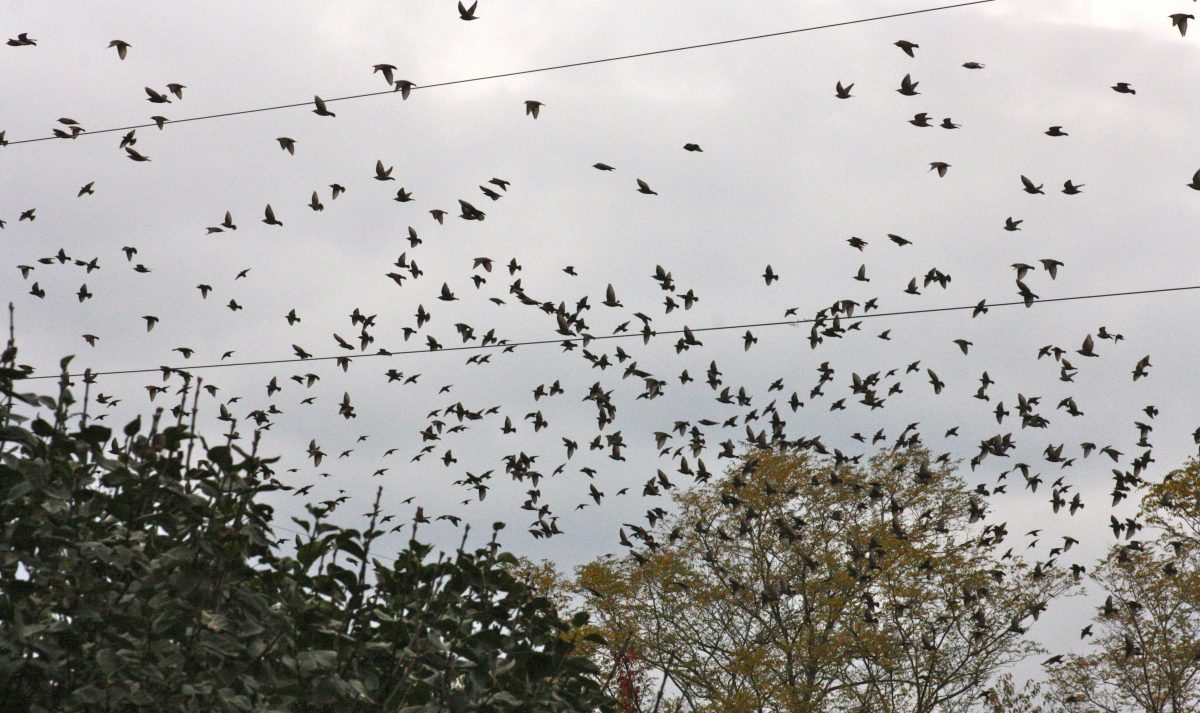 One day recently it was so noisy outside I stepped out to see what all the chatter was, only to find these birds flying out of the trees, it was like a scene from the movie Birds, in Finleyville Twp. (Charlotte Sickles)