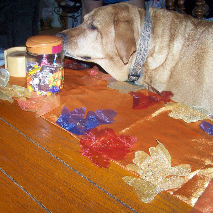 Jazz is wishing he had thumbs to open the Halloween candy dish. Jazz is the golden lab of Paul and Melanie Lemley of Washington is wishing the lid would fall off. (Melanie Lemley)