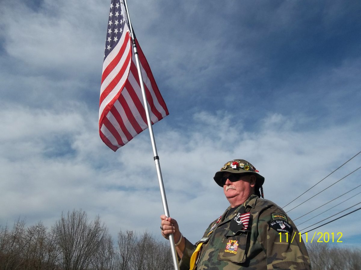 Was taken on Veteran's Day November 11, 2012. †My husband Larry L. Ashmore a disabled veteran of Washington, who served in the U.S. Army in Vietnam in 1968-1969 stood from 8:00 a.m. until 5:15 p.m. flying the American Flag on the Mounts Valley Road overpass above Interstate 70, to honor past, present and future Veteran's. He received thousands of honks, waves, thumbs up and peace signs for showing his pride in being an American Citizen. (Carolyn Ashmore)