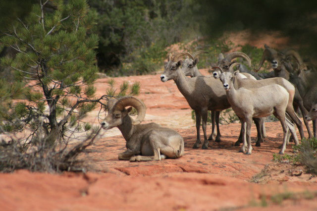 These are the sheep of Bryce Canyon taking a restful moment during their day so that all the tourist can get their picture. †It was taken the end of September in the late afternoon. The "boss" is lounging, watching over the others of his herd. (David Brendel)