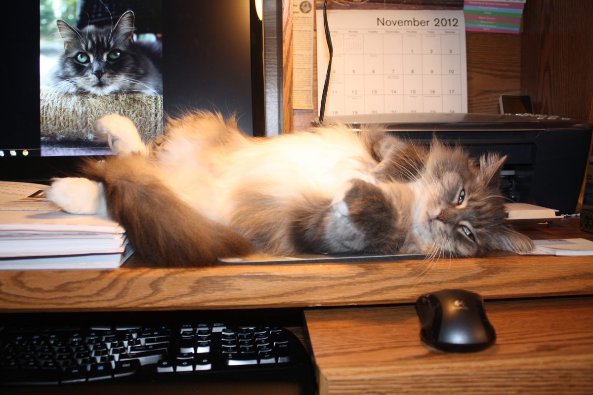 Here is my cat Fluff. †She enjoys the heat from my desk lamp and the attention she gets when she lies on her back. †She is just amazing. (Kerry †Pigeon)
