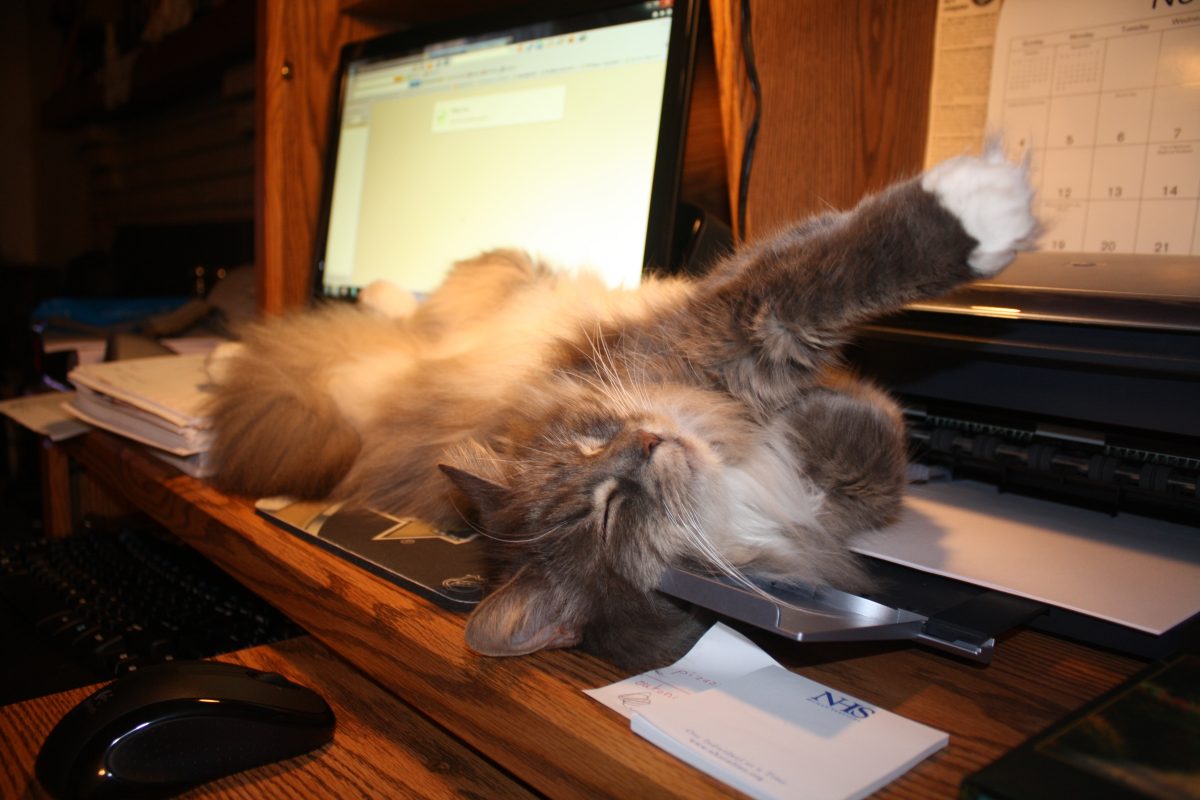 My cat Fluff enjoys the heat from my desk lamp along with the attention she gets lying on her back. (Kerry Pigeon)