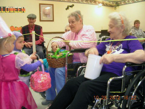 Humbert Lane residents Coleen Rodgers and Margaret Watkins passing out candy to Colie Few and Jayden Grimm. Dale Fitzgibbon in the background is enjoying all the costumes.