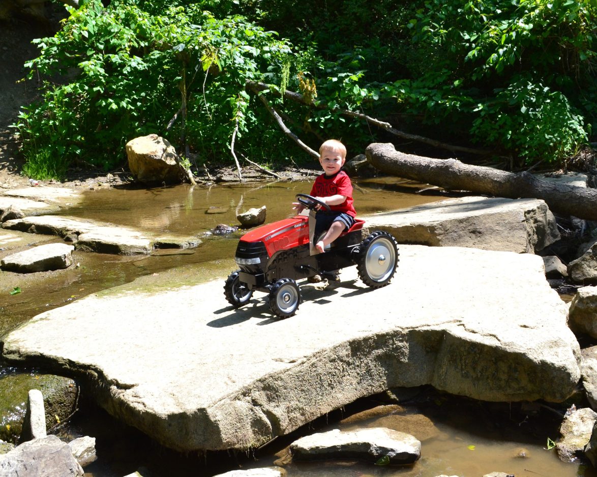 One year old Jaxon Orr, Son of Craig and Sadie Orr of Eighty Four, Pa plays on his tractor on a creek bed rock at Mingo Park as his mother takes his one year photos. (Sadie Orr)