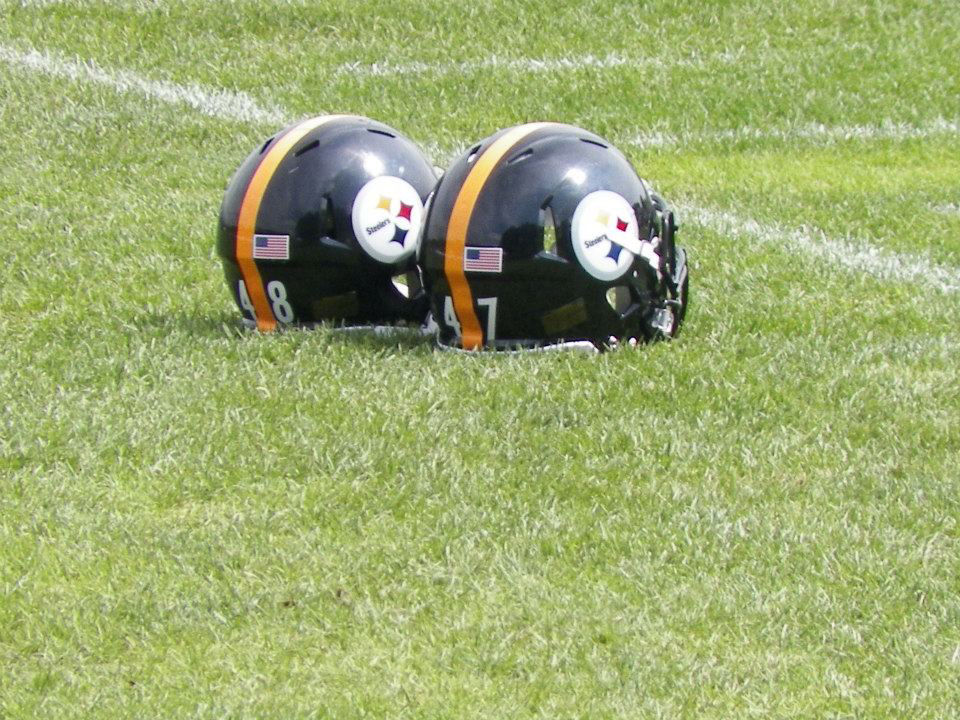 This picture was taken at Steelers Training Camp at St. Vincent College in Latrobe, PA. It shows two steeler helmets resting before the next drill. It has a nice contrast with the green grass. (JT Himmelrick)