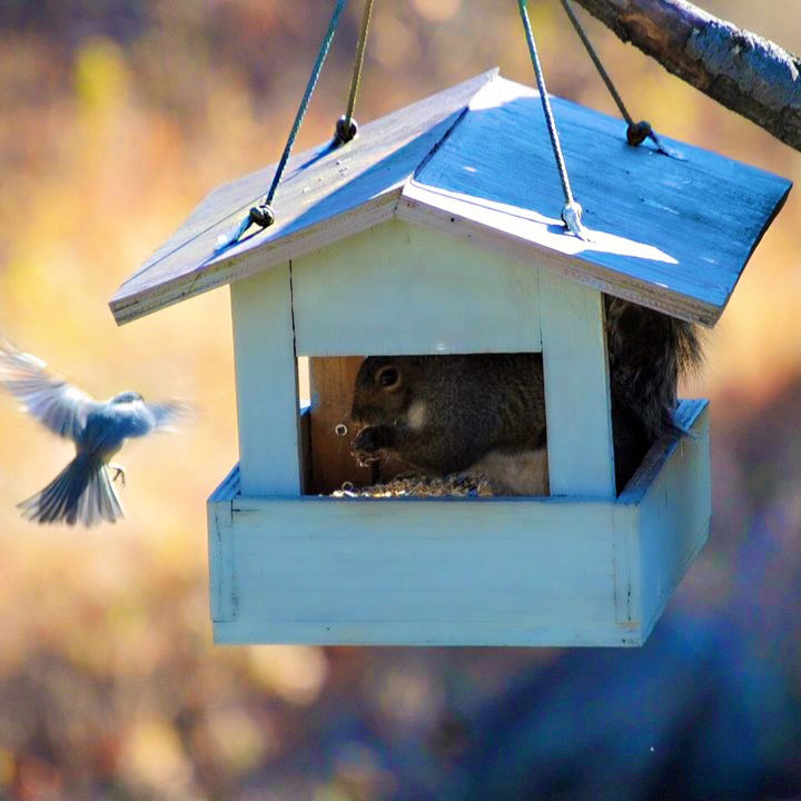 A squirrel is in the bird feeder while the bird is trying to get in. (Logan Dunlap)