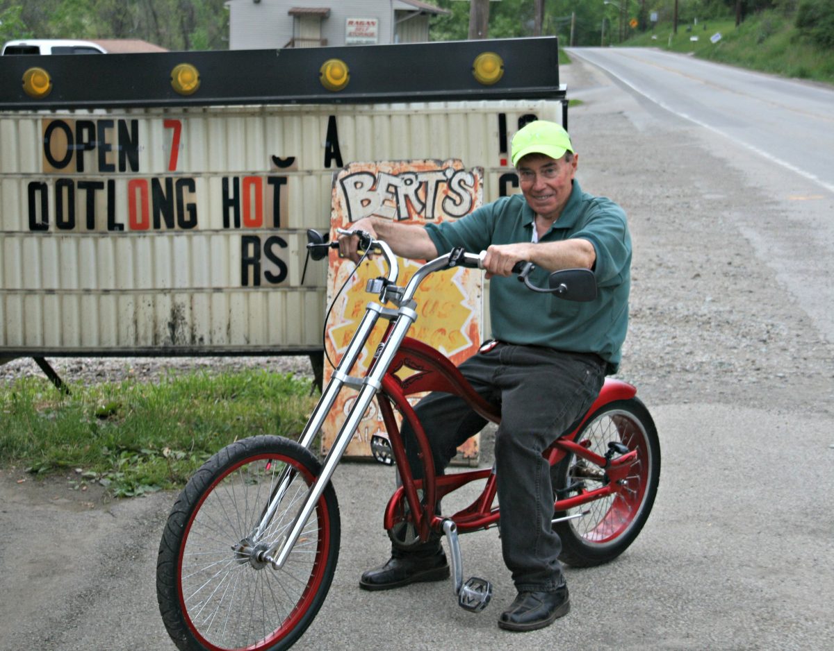 This photo of the late, Robert Anderson, of Cross Creek was taken on a sunny day in front of his favorite coffee spot, Bert's Hot Dog Shop in Atlasburg, PA. Bob loved his red, chopper pedal bike that he proudly put together and he would ride it to Bert's to chat with his buddies. This photo was taken by family friend, Tino Woodburn and edited by his grand-daughter, Deneen Pancari. His friends at Bert's left a cup of coffee sit out in honor his honor and memory the evening of his funeral. The love and friendships in this small town are outstanding. He will be missed every day.