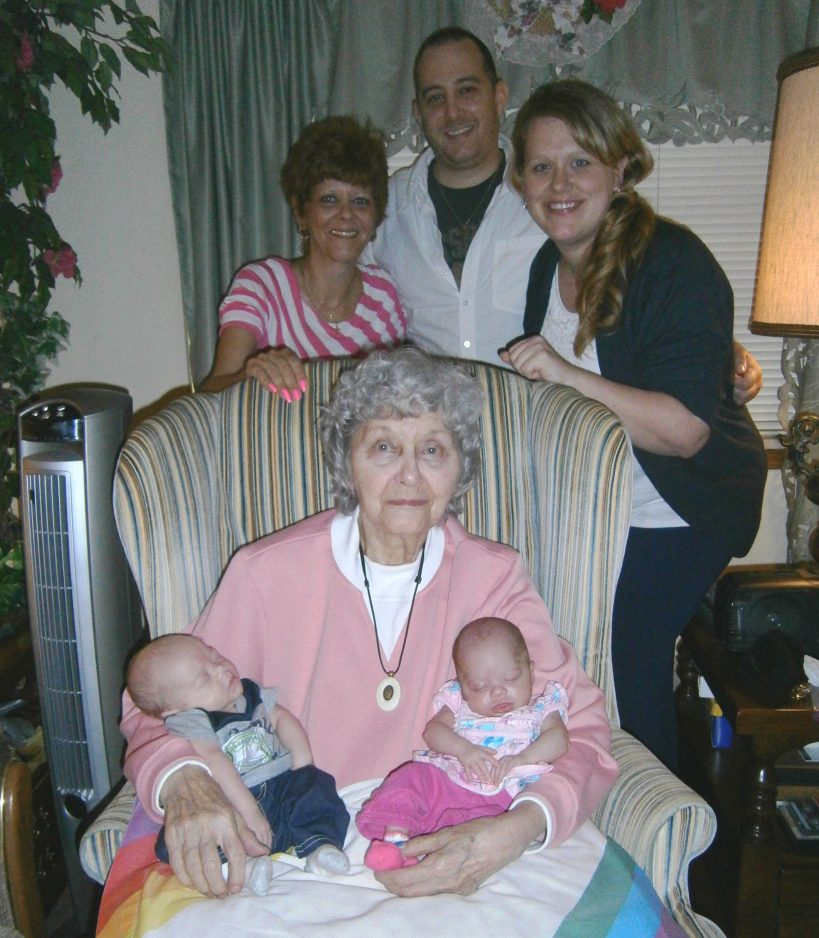 Great Grandmother Dorothy Koval holding Andrew John Douglas and Savannah Apryl Douglas. Born August 22, 2012. Standing are grandmother Paula Charlton, father David Douglas and mother Crystal Long. Submitted by Lois Koval.