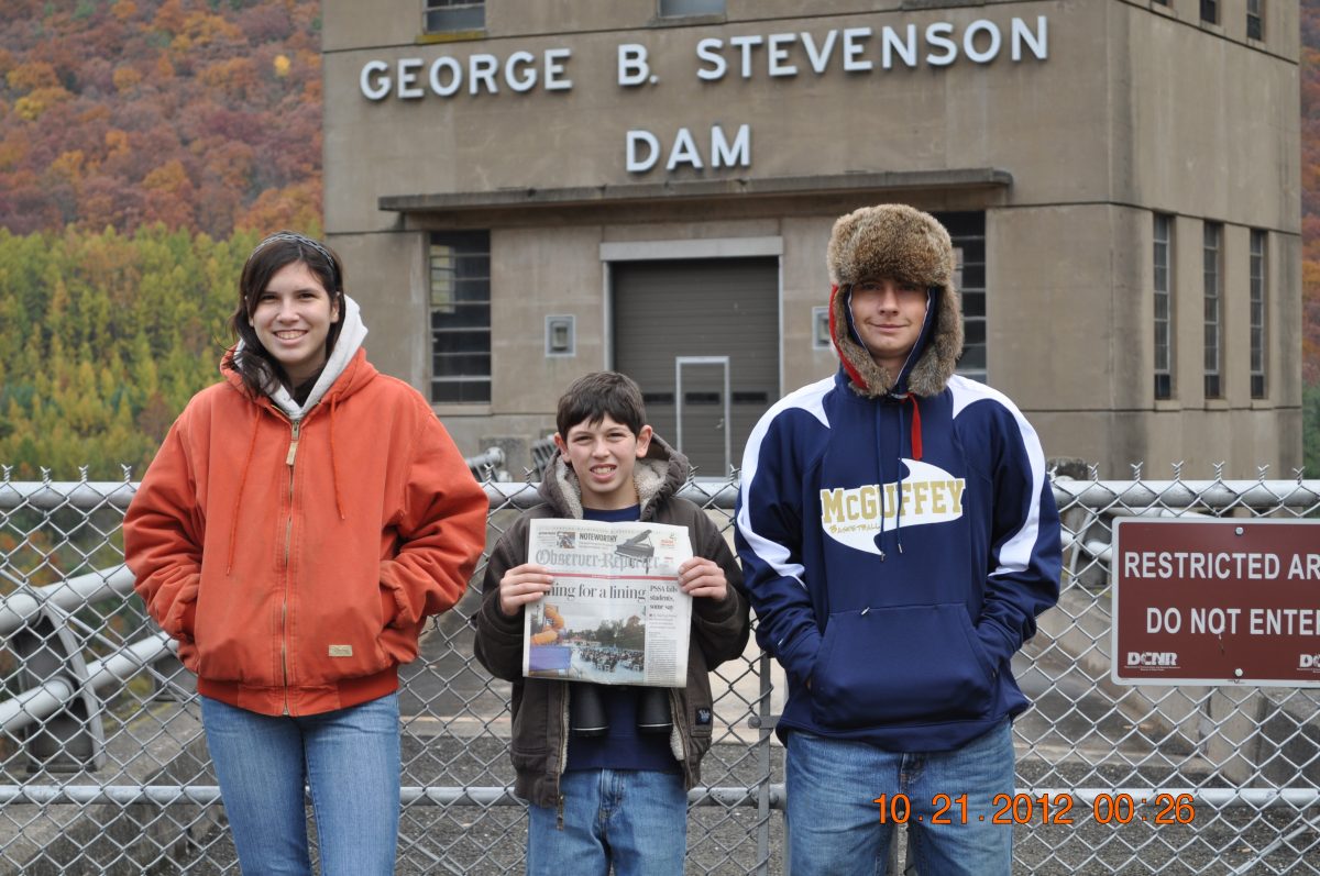 The McCann and Dorsey families visited Benezette, PA and the surrounding areas. One of their stops included George B. Stevenson Dam in Sinnemahoning State Park. Shown with the O-R is Brooke and Noah Dorsey, and Travis McCann. (Susan McCann)