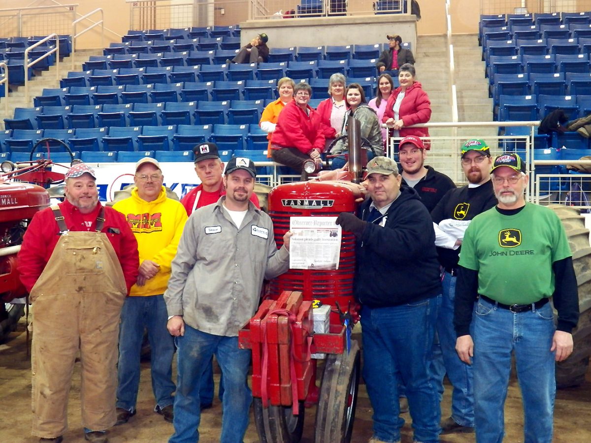 A group of 16 from the Washington area headed to Harrisburg for the 97th Pennsylvania State Farm Show on Jan. 9, for the 5th annual Antique Tractor Show and Pull. In the front row are Roy Ealy, Shawn Moore, JD Wyeth and Keith Aggers; second row, George Marth and Steve Aggers; third row, Larry Litman and Doug Endy. Sitting in the bleachers are, first row, Linda Ealy, Loryn Wyeth and Jennette Marth; second row, Penny Wyeth, Myrta Litman and Debbie Endy.