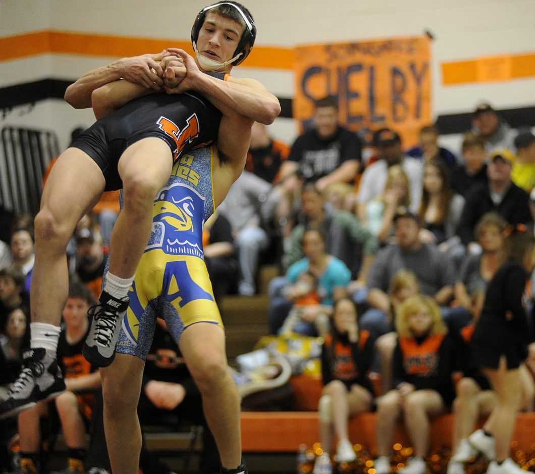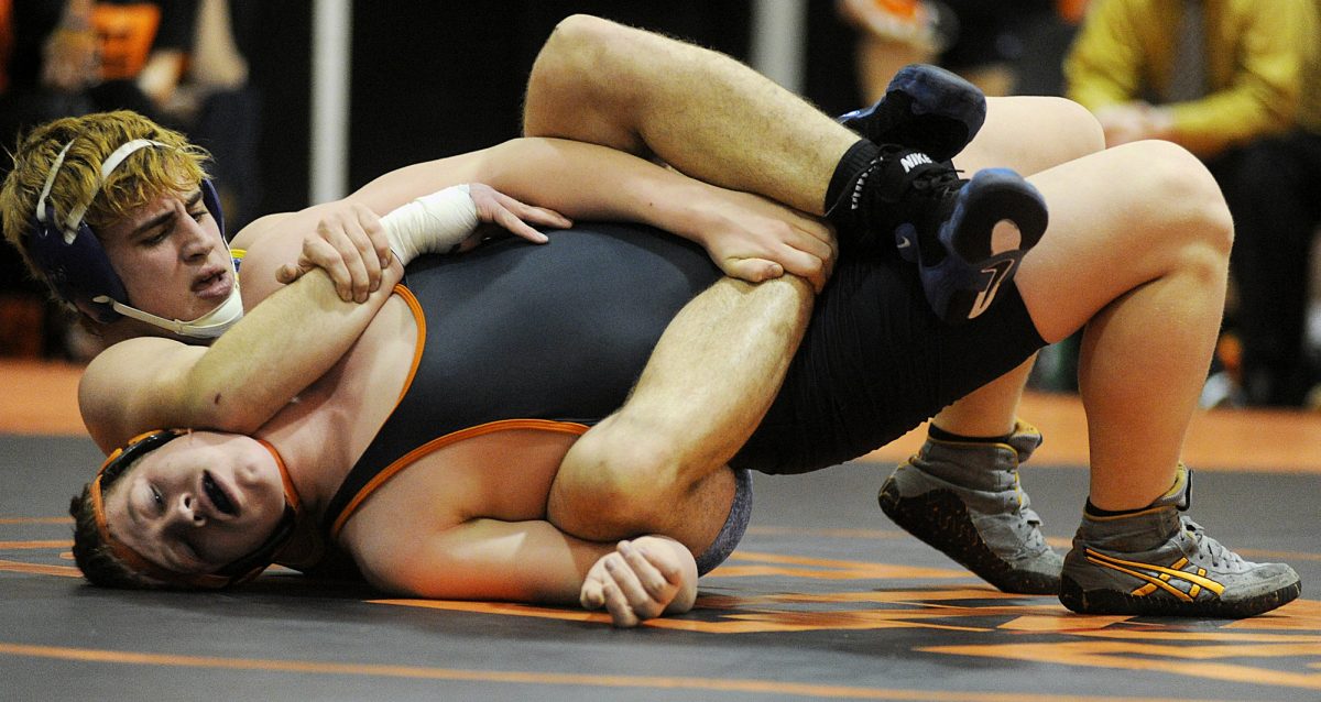 Katie Roupe / Observer-Reporter Avella’s Sean Meredith lifts Jefferson-Morgan’s John Demaske in the 132 pound bout. Demaske won by a tech fall 15 to 0.