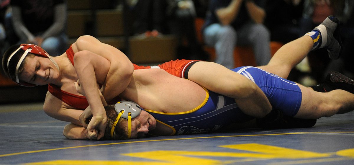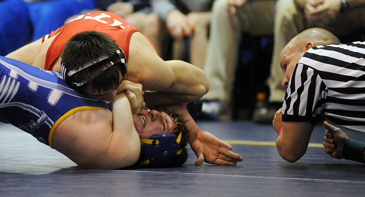 Kittanning’s Jacob Robb wrestles West Greene’s Jeffrey Isiminger during the 170 bout. Robb won 16 to 0.