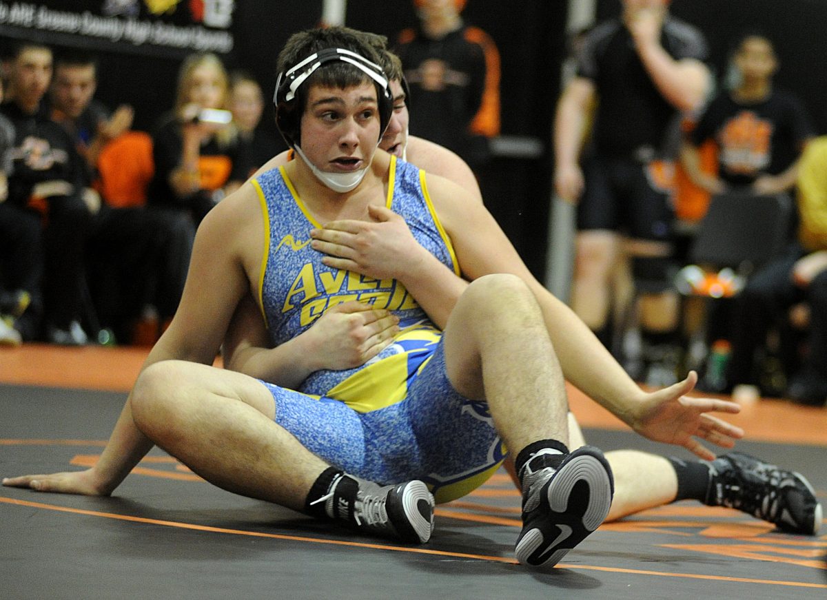 Katie Roupe / Observer-Reporter Avella’s Zachery Simonelli tries to control Jefferson-Morgan’s Anthony Patterson in the 182 pound bout. Simonelli won 16 to 4.