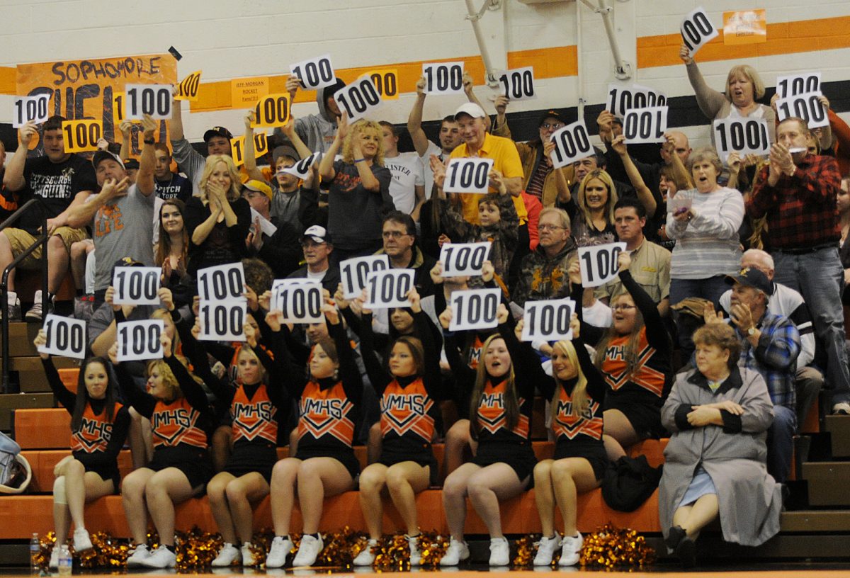 Katie Roupe / Observer-Reporter Jefferson-Morgan fans raise signs to celebrate the Rocket’s Jason Miller’s 100th career win in the 145 pound bout.