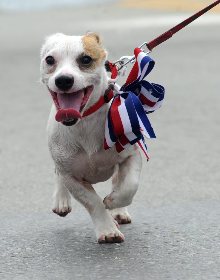 Katie Roupe / Observer- Reporter Even the dogs get in on the celebration as this pooch from the Pet Search, a non-profit animal rescue and placement service, trots down Pike Street with a big bow attached.