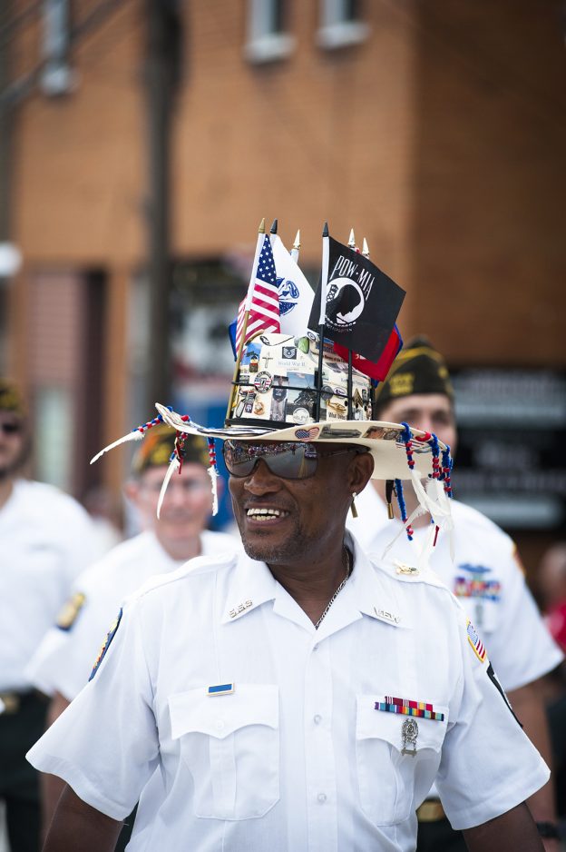 Emily Harger/Observer-Reporter A member of the North Strabane VFW 553 sporting his Fourth of July hat marches through the Canonsburg Fourth of July parade.
