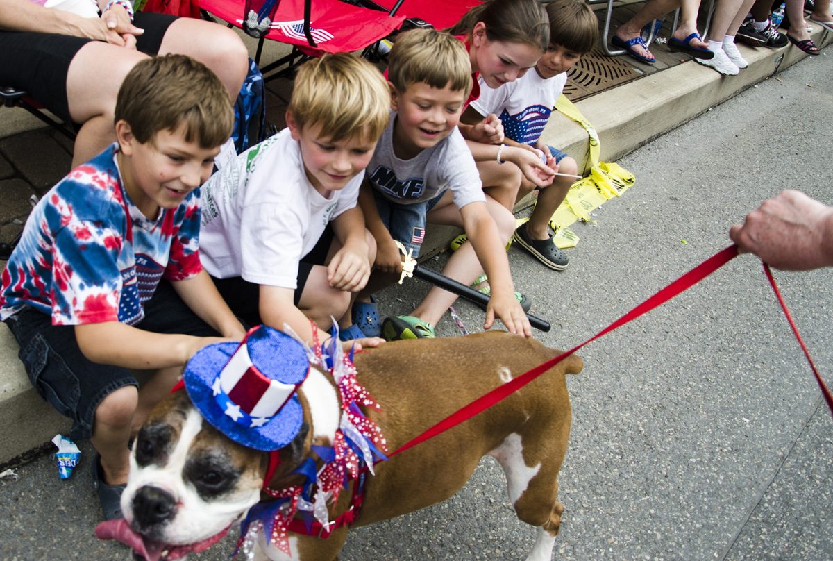 Emily Harger/Observer-Reporter From left to right, Owen Wudkwych, Shane Heron and AJ Wudkwych of Hickory pet Fourth of July dressed dog of the Canonsburg Fourth of July parade.