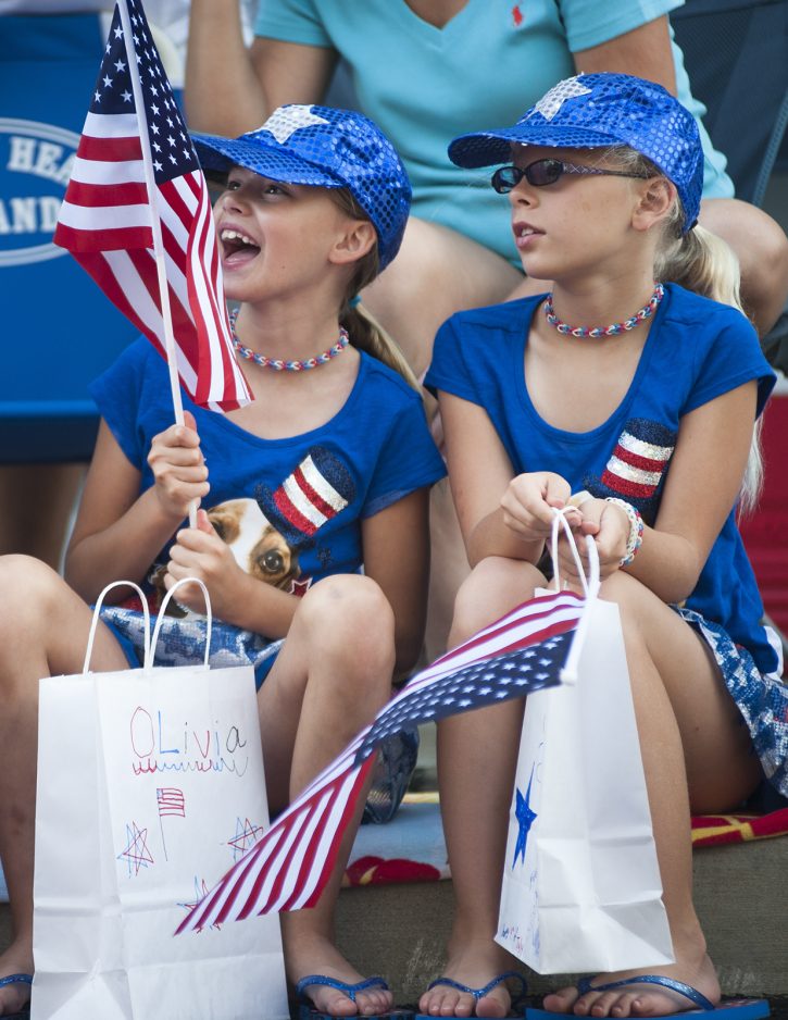 Emily Harger/Observer-Reporter Olivia Antonace, 8, and Alexis Leman, 10, with matching outfits get excited that volunteers are passing out free American flags at the Canonsburg Fourth of July parade on Thursday morning.