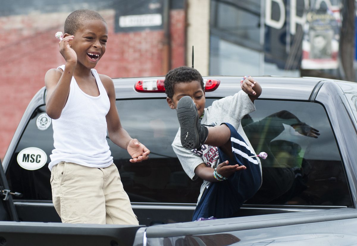 Emily Harger/Observer-Reporter Juan Worthy, left, and Jean Yandel, right, toss candy to the parade crowd from the Washington High School Cheerleaders parade float at the Canonsburg Fourth of July parade.