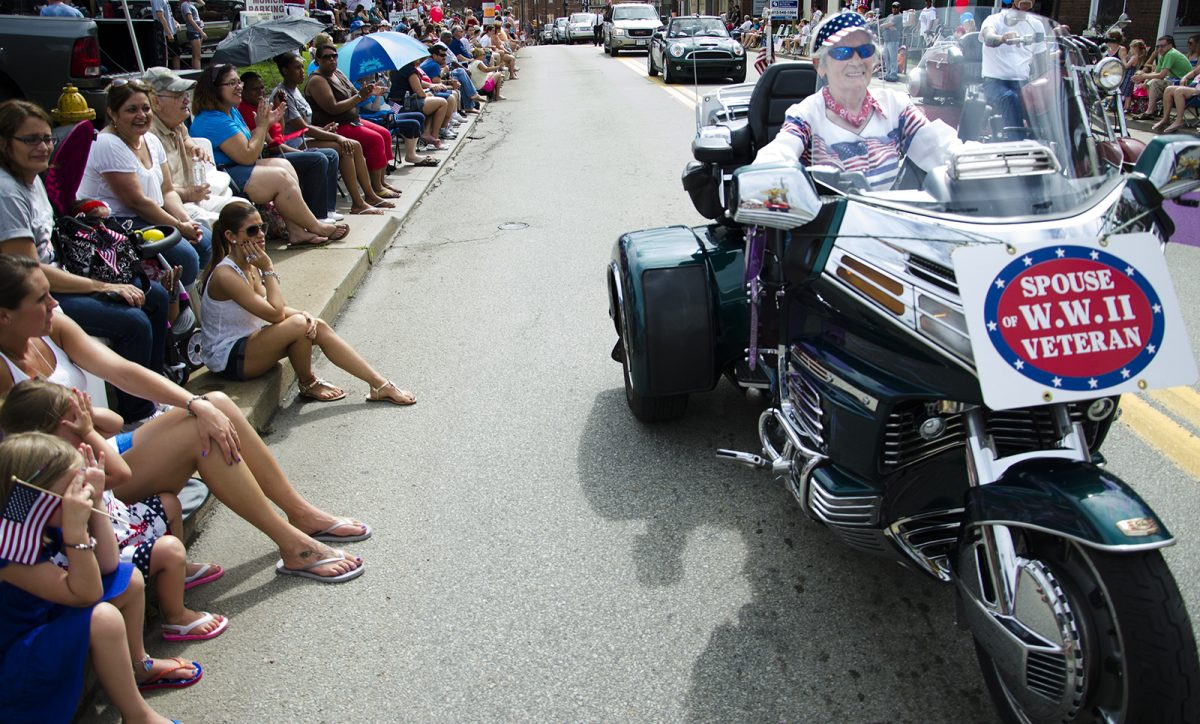 Emily Harger/Observer-Reporter A wife of a World War II veteran rides through the Canonsburg Fourth of July parade as parade-goers watch on the sidewalk of West Pike Street on Thursday morning.