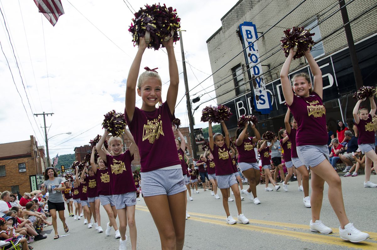Emily Harger/Observer-Reporter Chartiers-Houston youth cheerleaders cheer for their school and their country through the street during the Canonsburg Fourth of July parade.
