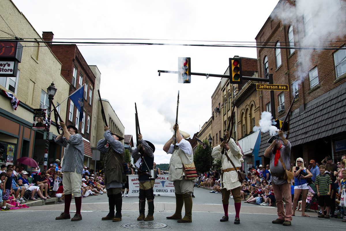 Emily Harger/Observer-Reporter Revolutionary War reenactors fire a salute to their country as part of the Canonsburg Fourth of July parade on Thursday morning.