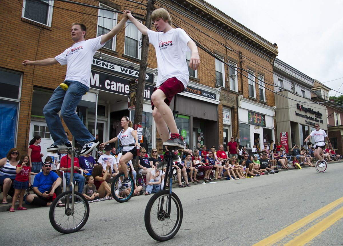 Emily Harger/Observer-Reporter Members of the Wonders Unicycle Club hold hands for other cyclers to ride underneath during the Canonsburg Fourth of July parade.