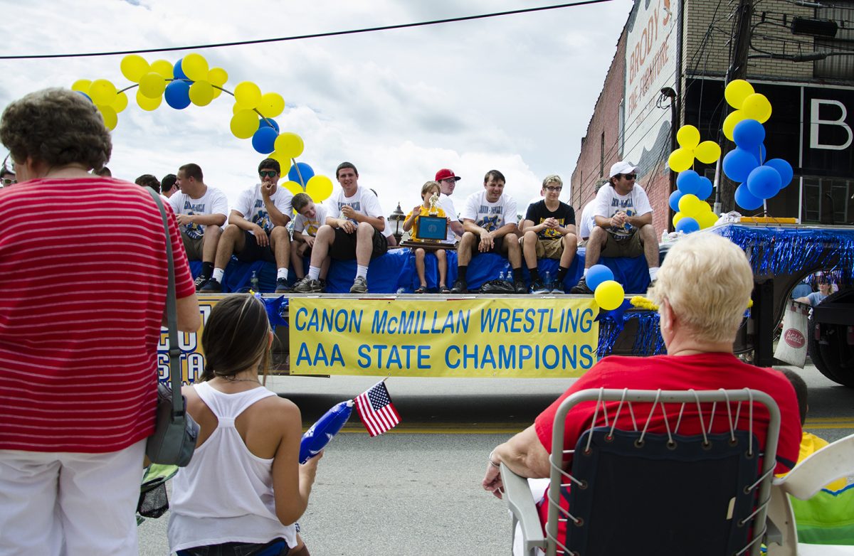 Emily Harger/Observer-Reporter The Canon-McMillan wrestling team parades on their float to celebrate their AAA State Championship title during the Canonsburg Fourth of July parade.