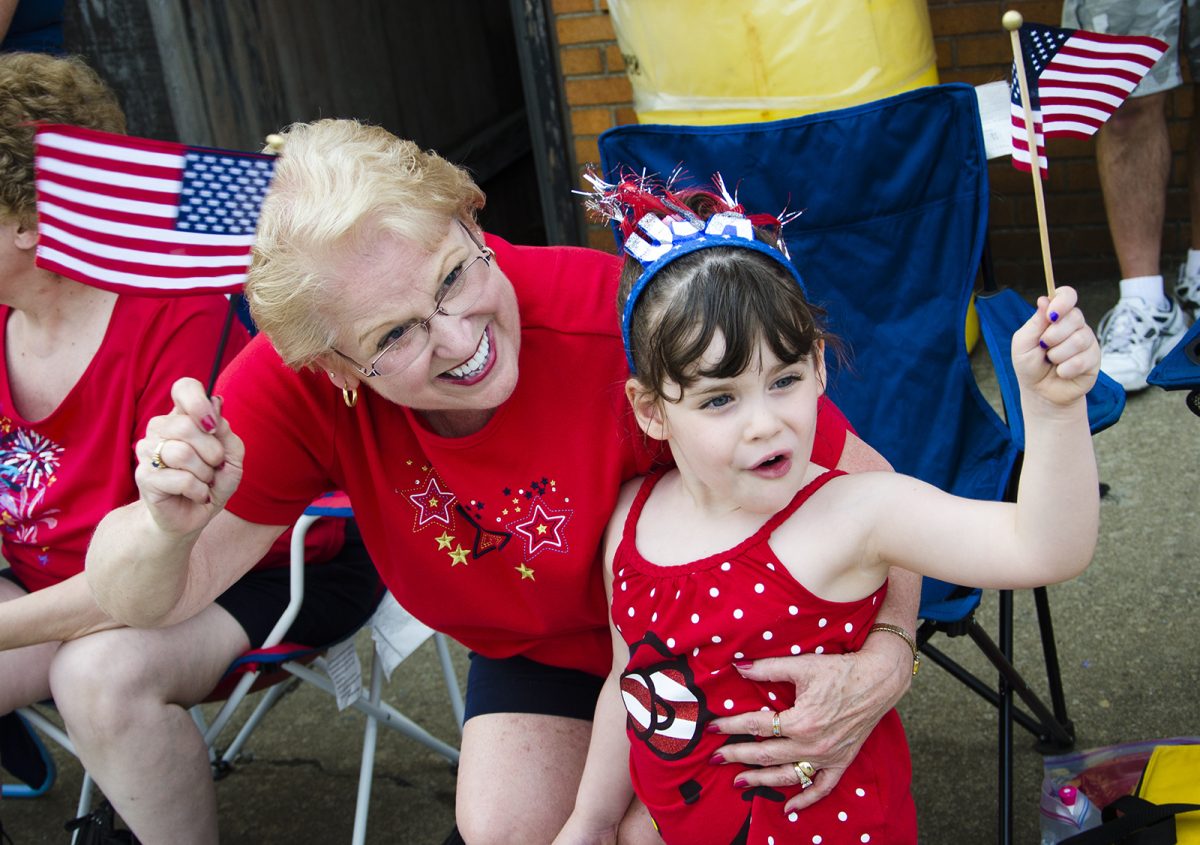 Emily Harger/Observer-Reporter Julie Piedrahita, 4, cheers for U.S. veterans marching through the Canonsburg Fourth of July parade as her grandmother, Lauretta Darby encourages her to always support the troops.