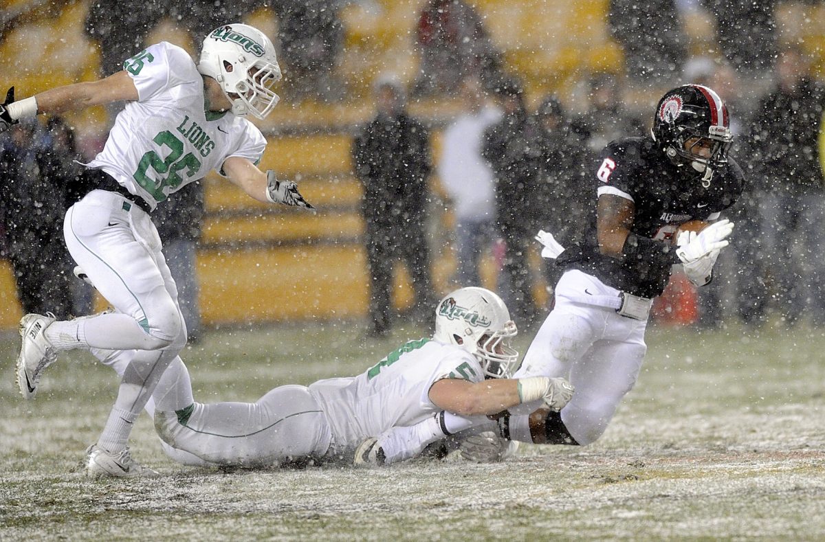 South Fayette’s #54 tackles Aliquippa’s #6 during the first half of the game.