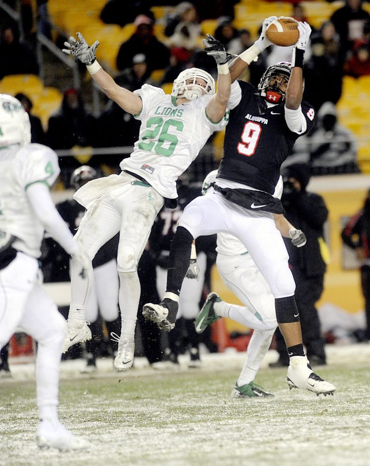 Aliquippa’s Patrick Anderson gets a 43 yard reception as South Fayette’s Conner Beck tries to block.