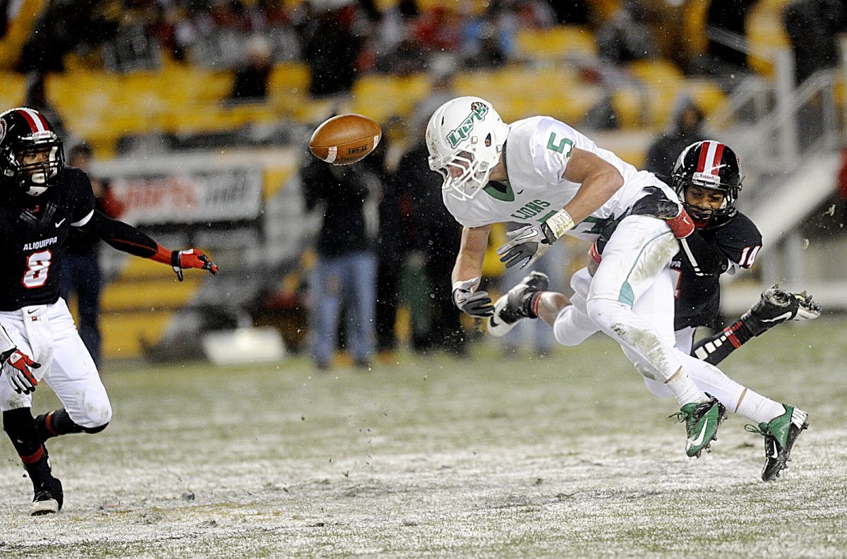 South Fayette’s Justin Watson lets a pass slip out of his hands and it is intercepted by Aliquippa’s Jyier Turner during the first quarter.