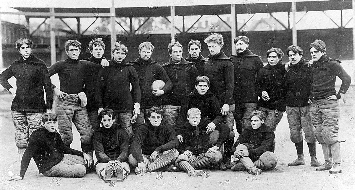 The earlier picture was taken around 1900, before the introduction of helmets and shoulder pads. All the members of this Washington & Jefferson College squad are wearing shin guards and padded pants, however.