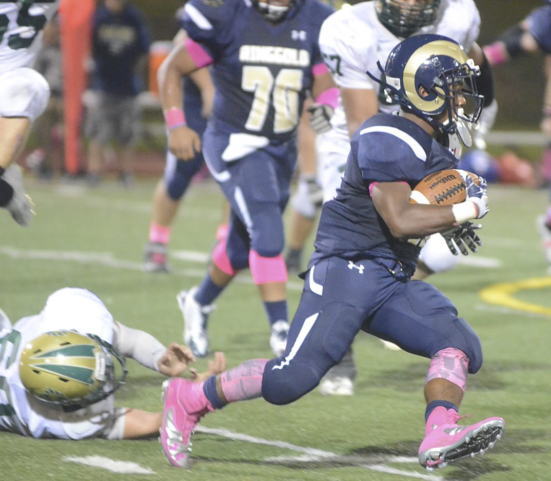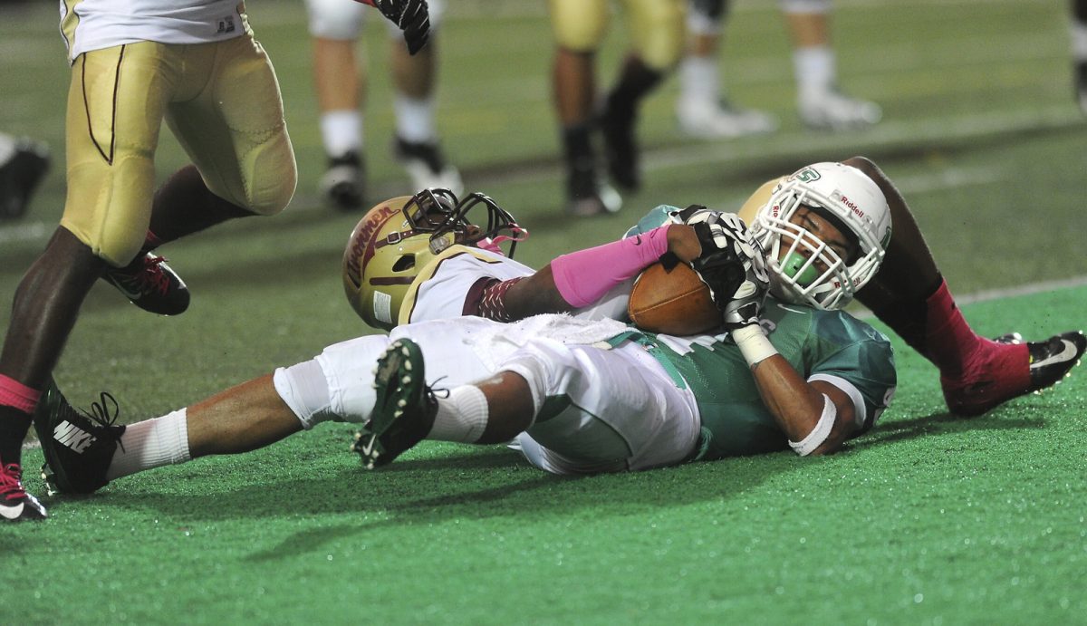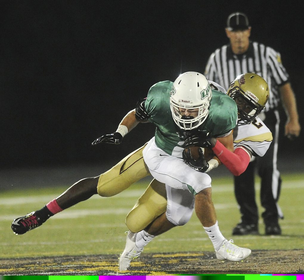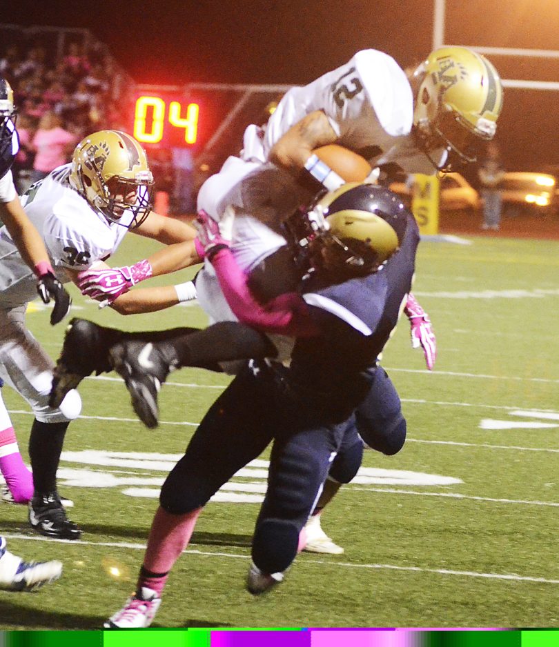 Belle Vernon’s Marcel McCaskill (12) leaps to try and avoid Ringgold’sLuke Baldesberger (11) to no avail in the 1st quarter at Joe Montana Field at Ringgold High School Friday night.
