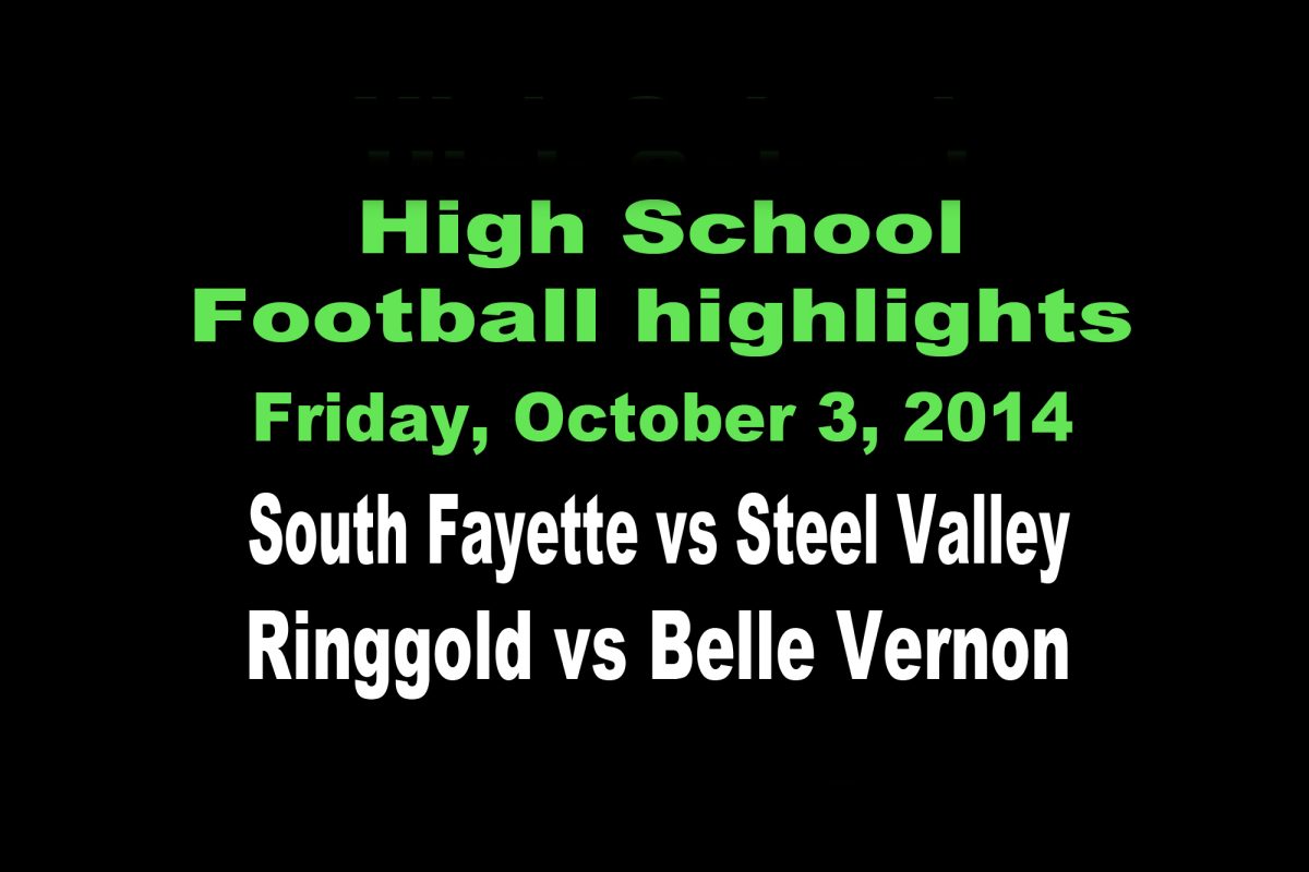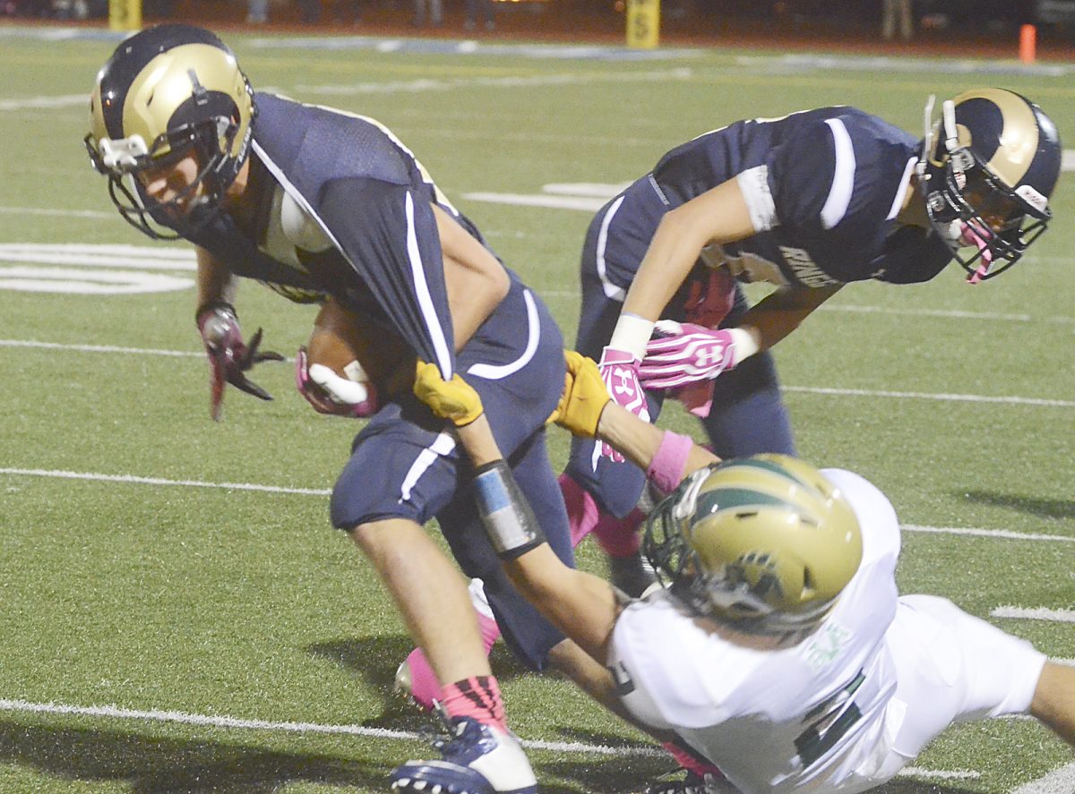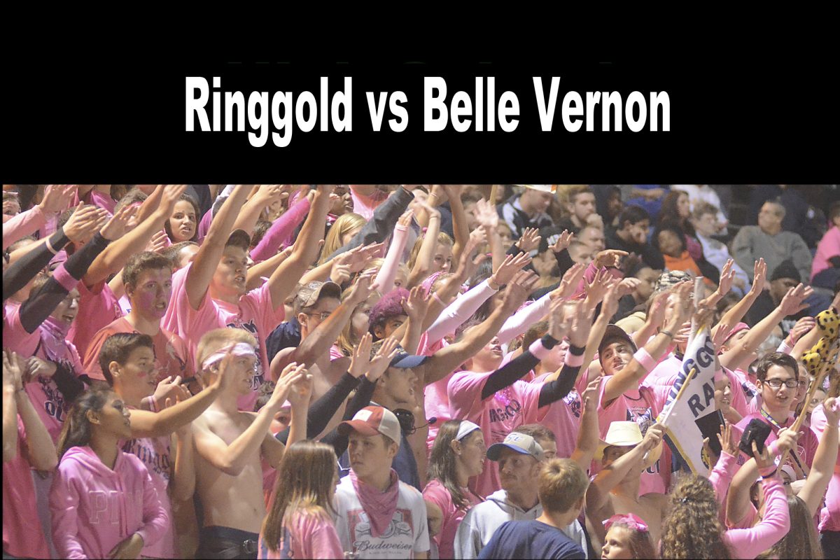 Belle Vernon’s Luke Dirigon (3) has plenty of help from teammates, Phil Taylor (8) and Michael Garzaelli (62) to block Ringgold’s Nico Law (4) for a big gain in the 2nd quarter at Joe Montana Field at Ringgold High School Friday night.
