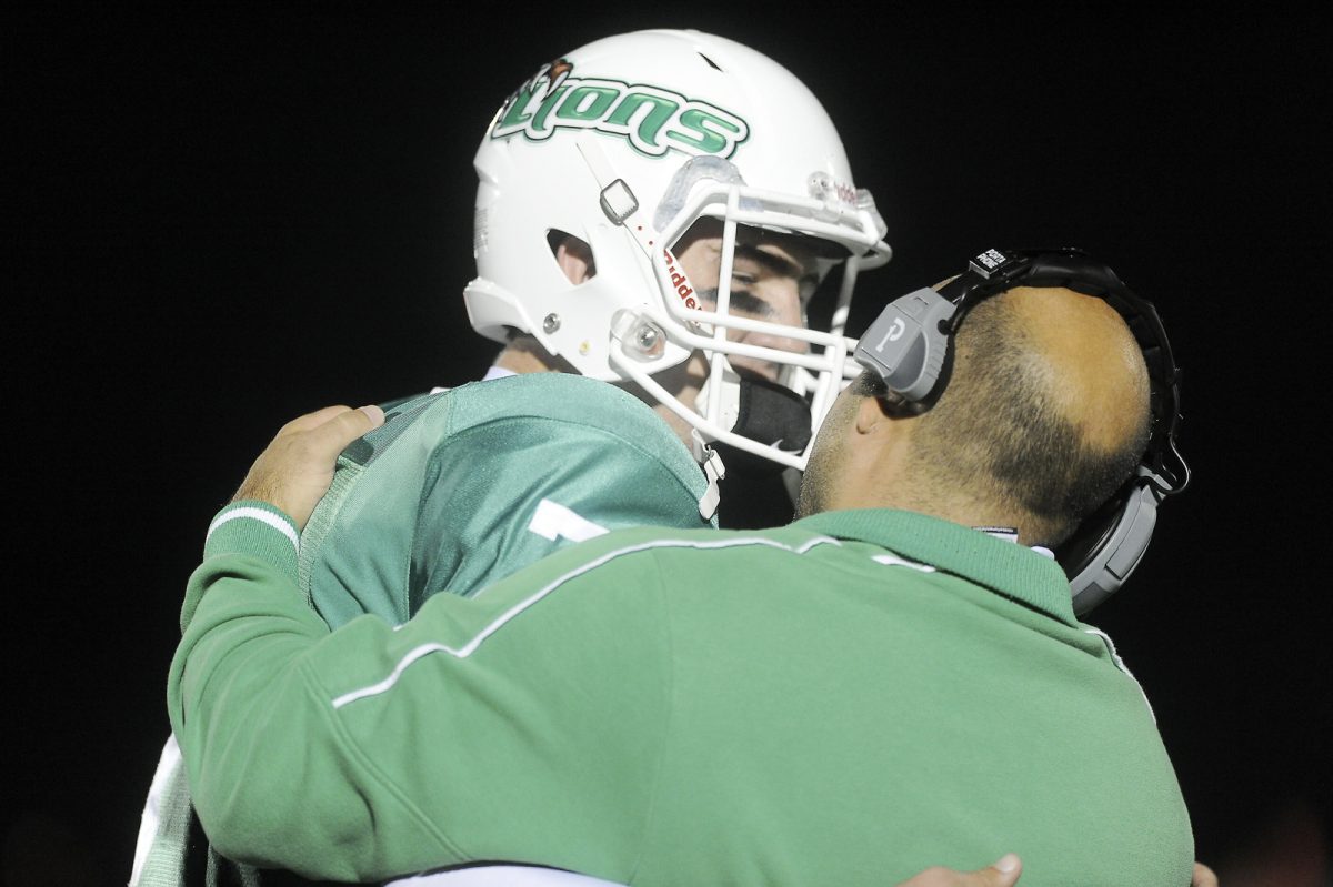 South Fayette’s head coach Joe Rossi congratulates Brett Brumbaugh after he broke the WPIAL record for passing yards in the first half of the game.