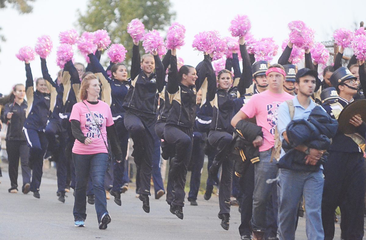 Pom poms high as Ringgold’s drill team marches with the band marches from the high school down to the Joe Montana Field prior to the game against Belle Vernon Friday night.