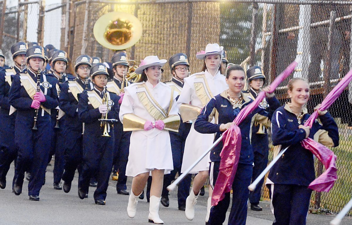 Ringgold’s marching band marches from the high school down to the Joe Montana Field prior to the game against Belle Vernon Friday night.