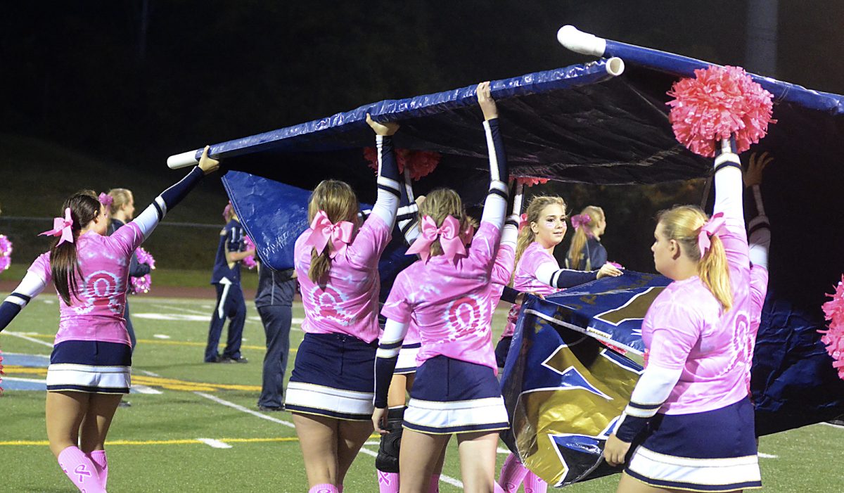 Ringgold’s cheerleaders carry the banner onto the field before the team comes out at Joe Montana Field at Ringgold High School Friday night.