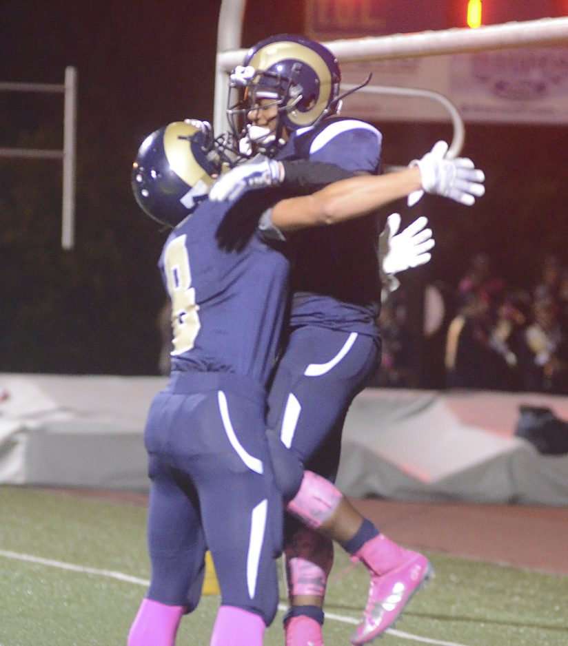 Ringgold’s Chacar Berry (3) gets a big hug from his teammate, Mayson Atkinson (8) after scoring a touchdown in the 2nd quarter at Joe Montana Field at Ringgold High School Friday night.