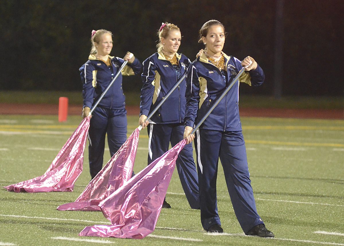 Three of Ringgold’s flag girls pause in their routine prior to the game against Belle Vernon Friday night.
