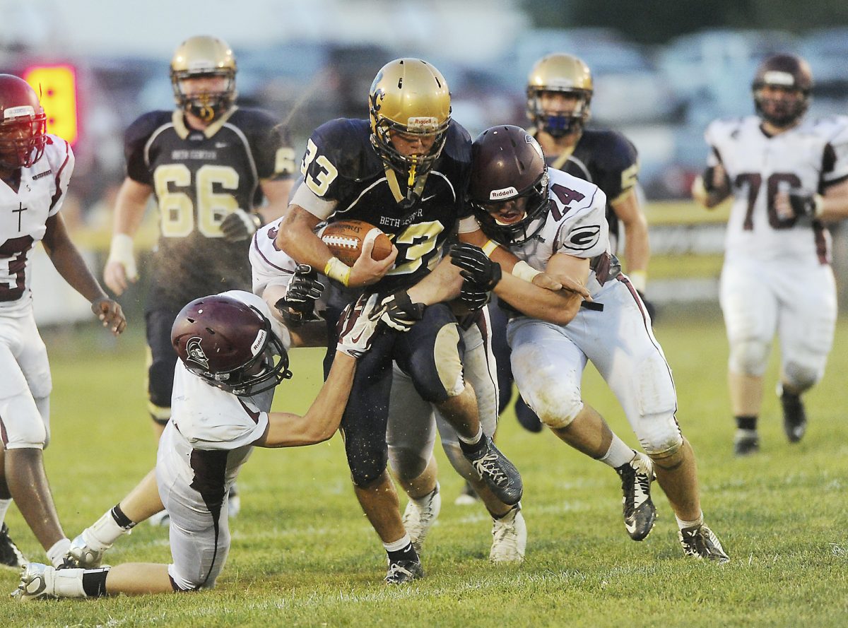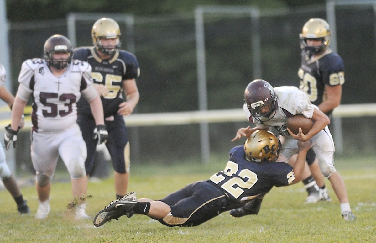 Beth Center’s Johnny Sofran tackles Greensburg Central Catholic’s Sam Nowicki during the first half of the game.