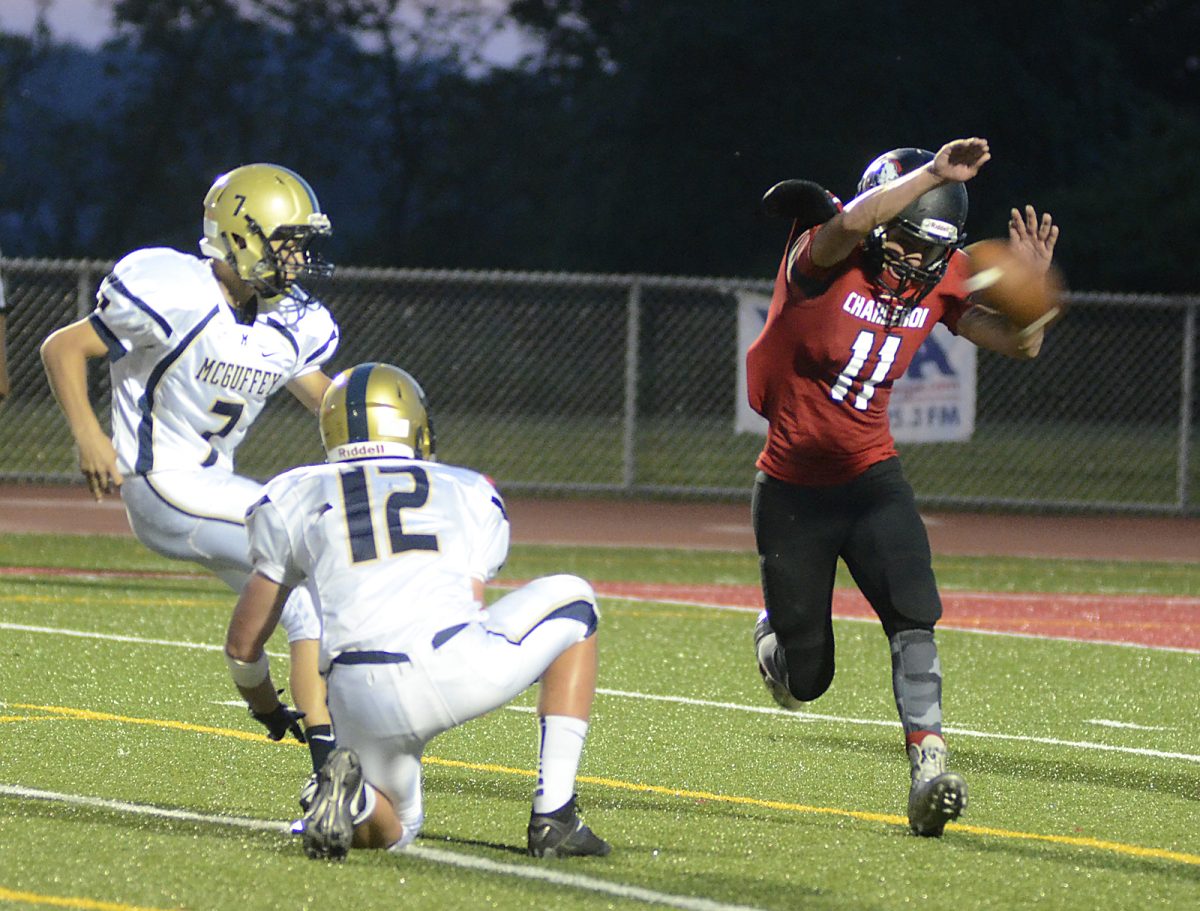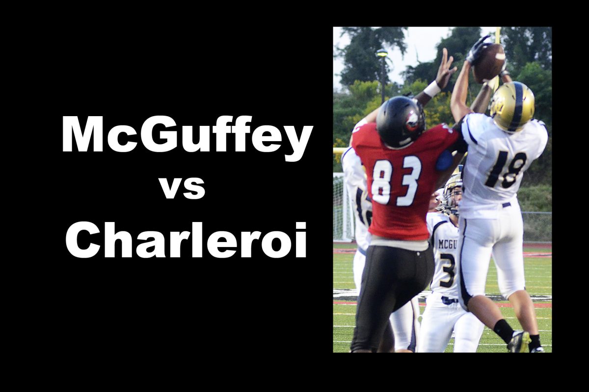 McGuffey’s Nick Haynes (18) successfully battles Charleroi’s John Arnold (83) for an interception ending Charleroi’s drive in the 2nd quarter at Charleroi High School field Friday night.