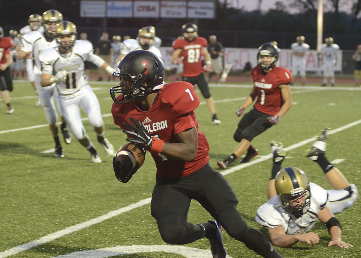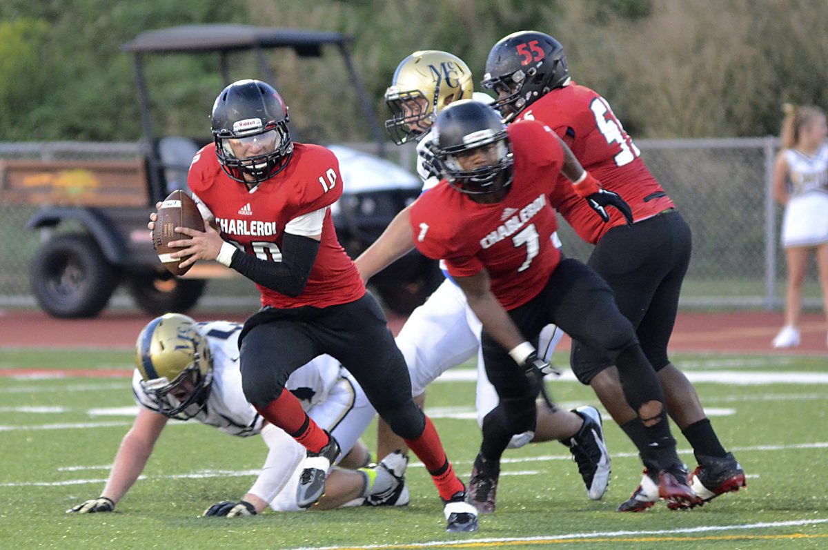 Charleroi’s Rasheed Hairston sweeps arpund end leaving tacklers behind in the 2nd quarter at Charleroi High School field Friday night.