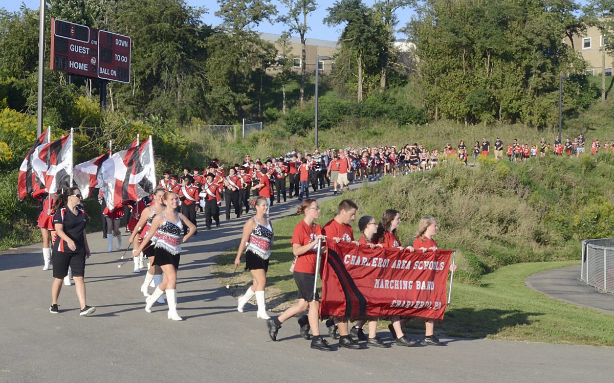 Charleroi High School marching band marches down the hill to the field for pregame prpgram at Charleroi High School field Friday night.